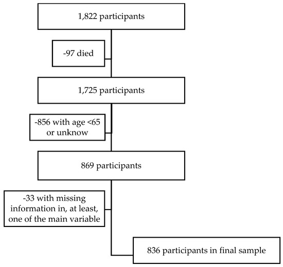 Data from the Wave 8 COVID-19 Survey 1, Release version: 8.0.0, of the Survey of Health, Ageing and Retirement in Europe (SHARE) project were used [29]. In Portugal, the survey was conducted from June to August 2020, within panel households, using computer-assisted telephone interviews (CATI) due to the COVID-19 pandemic and the enforcement of lockdown measures [30]. A total of 1822 individuals participated. Study exclusion criteria included participants aged below 65 years or with unknown age (n = 856) and those with missing data (n = 33) in at least one of the following variables: feeling nervous in the last month, feeling sad or depressed in the last month, trouble sleeping recently, or how often they felt lonely. Consequently, the final sample for this study consisted of 836 participants (Figure 1). Comprehensive methodological information, including sampling procedures and the operationalization of variables, can be found in the SHARE Corona Survey Release Guide 8.0.0.