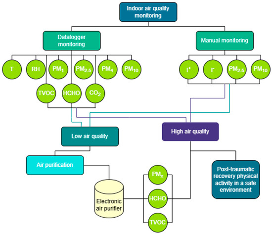 Although it is recognized that the environment in which rehabilitation takes place directly influences its effectiveness, indoor air quality (IAQ) is rarely systematically assessed in studies analyzing home rehabilitation [27,28]. Thus, the need for a multidisciplinary approach that includes, along with the physical component, also the optimization of IAQ conditions becomes evident, in order to support an efficient, safe, and sustainable recovery in a residential space. In a context where modern homes are increasingly airtight and daily activities contribute to the accumulation of indoor pollutants, the continuous monitoring of IAQ parameters becomes a necessity to protect the health of occupants, especially in the case of vulnerable people or those undergoing medical recovery. Multiple studies have highlighted that the use of real-time monitoring systems, based on multiparametric sensors and advanced technologies, allows for not only the prompt detection of harmful values, but also effective intervention through automatic purification systems or appropriate corrective measures [7,18,29,30,31,32]. Various studies have considered IAQ monitoring and indoor–outdoor environment correlations, as well as IAQ during physical exercise (especially concentrations of CO2, CO, PM, NO2, etc.) which have an impact on health and require interventions to improve IAQ [8]. Therefore, the implementation of intelligent air detection and filtration solutions becomes a fundamental condition for maintaining a safe, healthy indoor environment compatible with physical activity or therapeutic recovery.