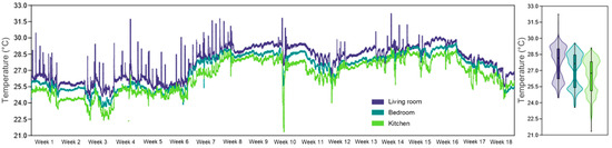 Evolution of T during the 18 weeks of monitoring, in the three analyzed rooms of the apartment, highlighting internal thermal variations in the context of IAQ assessment associated with physical rehabilitation at home.