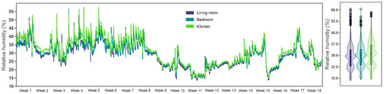 RH evolution during the 18 weeks of monitoring, in the three analyzed rooms of the apartment, highlighting the internal RH variations in the context of IAQ assessment associated with physical rehabilitation at home.
