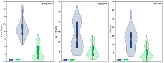 The living room recorded an average of 2180 ions/cm3 for I+ and 601 ions/cm3 for I−. On the other hand, in the bedroom, 1253 ions/cm3 were recorded on average for I+ and 556 ions/cm3 for I−, while in the kitchen, the average values were 1300 ions/cm3 for I+ and 484 ions/cm3 for I− (Figure 6; Table 1).