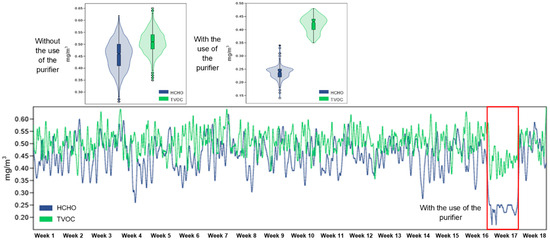 The evolution of the concentration of HCHO and TVOC inside the three rooms monitored over a period of 18 weeks, as well as the difference between the period in which the air purifier was used and the periods in which it was not used.