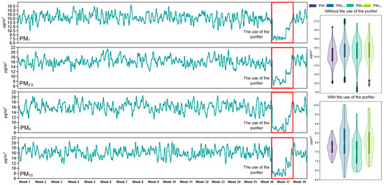 The evolution of the concentration of PM1, PM2.5, PM4, and PM10 inside the apartment was monitored over a period of 18 weeks, as well as the difference between the period in which the air purifier was used and the periods in which it was not used.