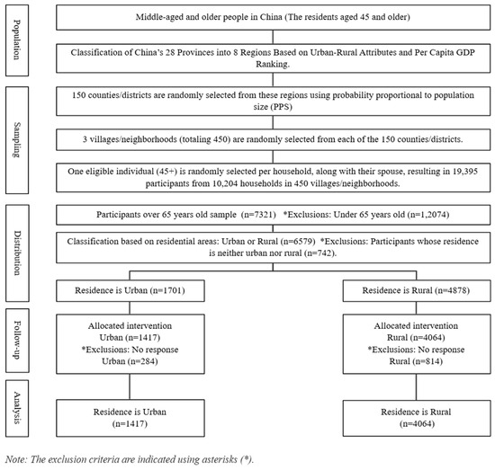 The CHARLS 2020 survey included 19,395 participants. Of these, 7321 were aged 65 years or older. This study examined differences in the experience rate of chronic diseases and depression symptoms among older adults based on their participation in PA, with a focus on urban and rural populations. Of the 7321 older adults, 4878 lived in urban areas, and 1701 lived in rural areas. However, 742 participants who lived in ‘unspecified geographic areas’ (e.g., urban–rural transition areas and special areas) were excluded from the analysis due to their limited representation and the unique social contexts they represented: peri-urban areas, government-led resettlement areas, policy-based migrant villages, central aged care facilities, remote military reclamation areas, and isolated mining or forestry areas. Subsequently, 1098 participants (284 urban, 814 rural) who did not respond to the main PA or health variables were also excluded. The final sample consisted of 5481 participants, 1417 from urban areas and 4064 from rural areas. Detailed information is presented in Figure 1, with the exclusion criteria indicated using asterisks.