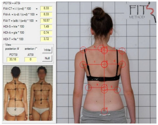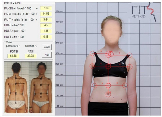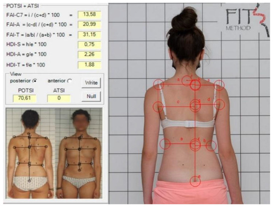 For POTSI and POTSI COR, the following landmarks were identified: spinous process of C7; the top part of the gluteal cleft; and bilaterally a point on the shoulder where the horizontal shoulder line intersects the vertical line extending from the axillary fold, the most prominent point of the posterior axillary fold, and the deepest waist indentation (Figure 2 and Figure 3) [13].