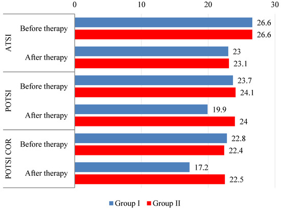 In corrected posture, the values of the Posterior Trunk Symmetry Index in Correction (POTSI COR) after treatment compared to pre-treatment were statistically significant only in Group I (p < 0.001), whereas in Group II the change was insignificant (p = 0.380). Significant differences between the groups were measured after treatment (p < 0.001); therefore, the treatment effect was significant in Group I (p < 0.001). Lower values after therapy were observed in 77.3% of the patients. The average improvement was 9.9 (improvement more than 5–71.01%) (Table 3, Figure 4).
