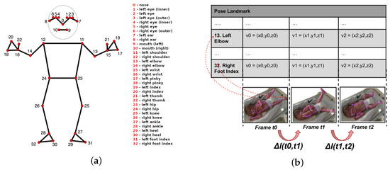 Regarding the postural data, which are the focus of the study described in this article, 33 landmarks were collected by the NRP platform for each frame of video using the Google AI-Edge MediaPipe library (see Figure 3a) (https://ai.google.dev/edge/mediapipe/solutions/vision/pose_landmarker (accessed on 27 June 2025)).