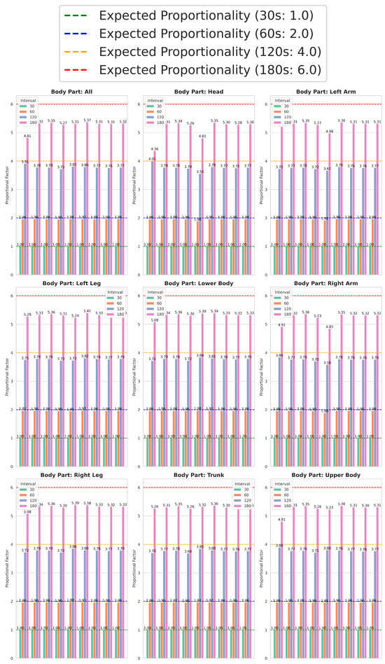 Finally, it is important to acknowledge that this work constitutes a pilot study based on a small sample of subjects, yet with a large number of structured data points per individual. Given this context, we opted for robust descriptive indicators—such as the coefficient of variation (CV) and relative differences between body regions—rather than inferential statistical tests. For instance, the CV values obtained ( and for Chebyshev and Minkowski, respectively) reflect low variability between full-body and regional movement estimates. This choice allowed us to evaluate the internal consistency and technical feasibility of our motion quantification approach. While not intended as a formal clinical validation, these results provide a strong basis for future studies involving larger cohorts and deeper statistical and clinical analyses.