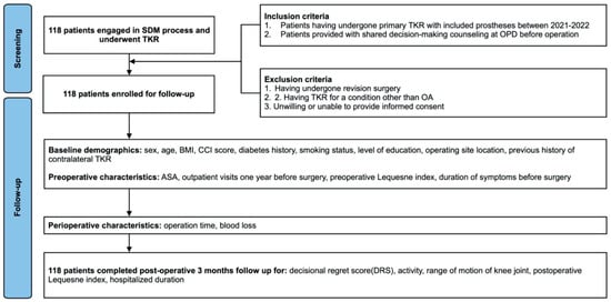 This study uses a prospective cohort of 118 individuals recruited from single care centers in Taipei, Taiwan between March 2020 and May 2022, who made a shared decision to undergo TKA. Inclusion criteria were patients who had undergone primary TKA and patients engaged in a shared decision-making process prior to surgery. The excluded criteria were patients who had a revision of TKA or any condition other than osteoarthritis, and patients who were unable to give informed consent. All 118 individuals who were included in the study completed a follow-up assessment at three months. The primary outcome was decisional regret assessed using the DRS, and the secondary outcome was post-operative pain at three-month follow-up, measured using the Lequesne Index. This dual-indicator approach was chosen to differentiate emotional outcomes (regret) from physical recovery metrics (pain and function), thereby allowing exploration of how objective post-operative states contribute to subjective regret. The decision regret score reflects patients’ psychological appraisal of the decision process and outcome, while the Lequesne Index provides a validated measure of functional limitation, which is a common source of dissatisfaction after TKA.
