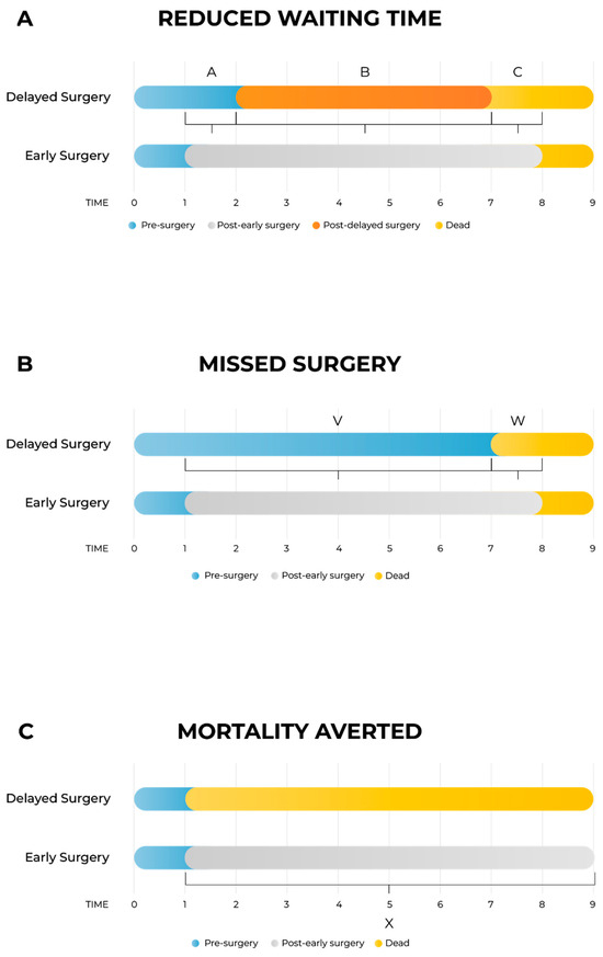 Schematic presentation of the model. Figure 1A: The model is divided into delayed surgery arm and early surgery arm. There are four health states: pre-surgery, post-delayed surgery, post-early surgery and death; three health states are on each arm as post-delayed surgery is exclusive to the delayed arm, and post-early surgery is exclusive to the early arm. (A) Time between early and delayed intervention; (B) time between delayed intervention and death; (C) time between death in the delayed surgery arm and death in the early surgery arm. Figure 1B: Schematic presentation of the model for the case when patients missed the surgery entirely. The segment V is time between early intervention and death in the missed surgery arm (corresponding to the segment A when the segment B is zero in Figure 1A), and the segment W is time between death in the missed surgery arm and death in the early surgery arm (corresponding to the segment C when the segment B is zero in Figure 1A). Figure 1C: Schematic presentation of the model for the special case when surgery is lifesaving. In this model, there are no segments A and B from Figure 1A or segment V from Figure 1B, and the segment X is time between death in the no-surgery arm and death in the surgery arm (corresponding to the segment C in Figure 1A).