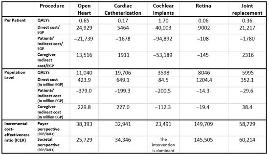 Figure 2 presents the aggregated results across all five priority interventions at the population level, weighted by patient numbers for each surgery. The Egyptian MoHP initiative to reduce surgical waiting times resulted in a total gain of 48,385 QALYs, with an incremental cost of EGP 2,264,156,090, inclusive of productivity losses. The corresponding ICER is EGP 46,795 per QALY, which falls within Egypt’s accepted cost-effectiveness threshold. Individual intervention results and their respective benefit–cost ratios are shown in Appendix G.