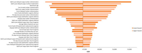 To test the robustness of the model, both a deterministic sensitivity analysis (DSA) and probabilistic sensitivity analysis (PSA) were performed using the incremental cost-effectiveness ratio (ICER) from a societal perspective, including indirect costs. The analyses were conducted for all surgeries combined, with results weighted by the number of patients in each surgical group. Total QALYs gained and total costs were aggregated across all surgeries at the population level (rather than per patient). The incremental cost was then divided by the incremental QALYs to generate a single, composite ICER representing the entire study population.