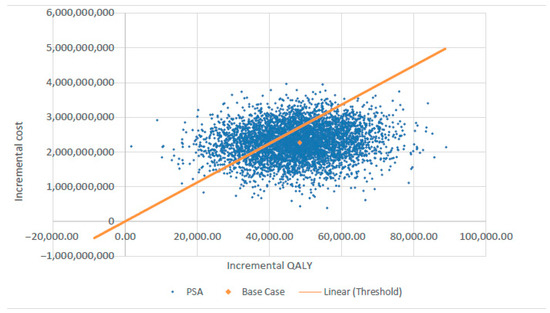 Probabilistic sensitivity analysis (PSA) scatter plot showing cost-effectiveness results. QALY—quality-adjusted life year.