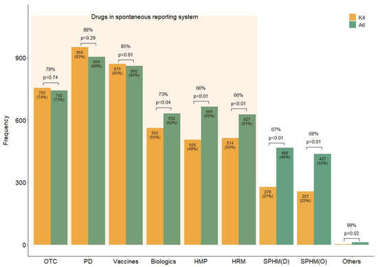 In addition to the drugs already included in the current domestic SRS, respondents believed that it should include all types of HMs, including SPHMs produced by KMIs rather than pharmaceutical companies (A6) (Figure 1). For questions with the same response choices (K4 and A6), the agreement between the response rates for each option was generally high; however, the number of suggestions to include HMs and biologics in the SRS (A6) was significantly higher than the awareness of their current inclusion status (K4) (Figure 1).