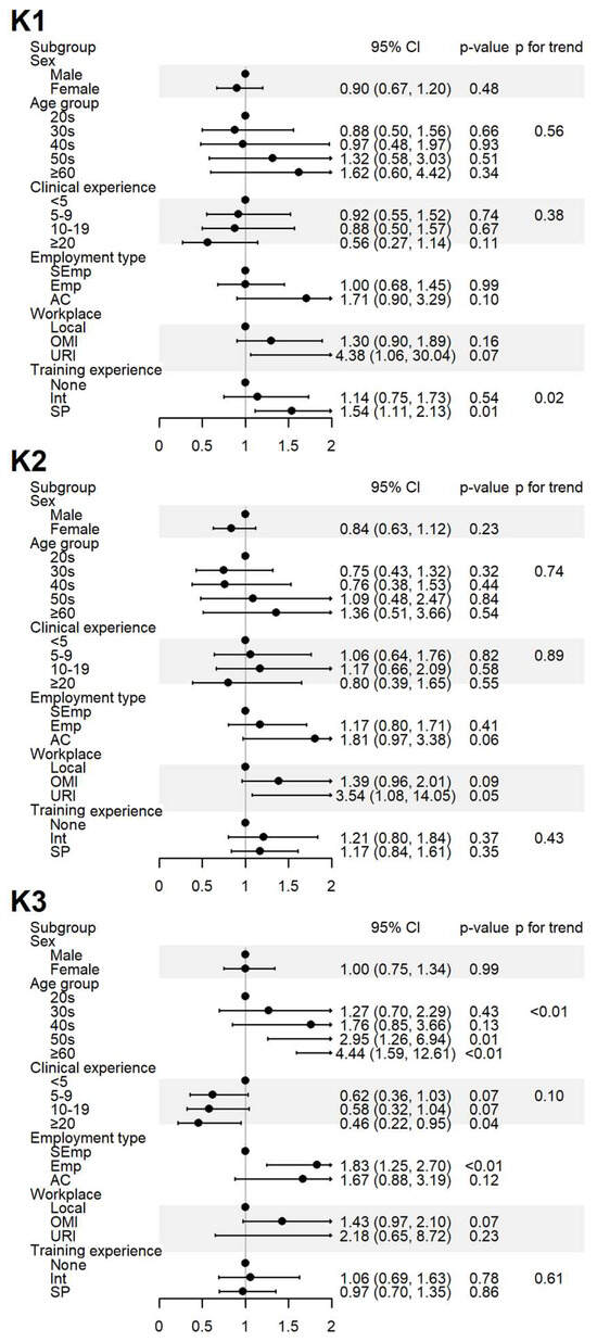 Sociodemographic factors affecting the respondents’ knowledge of spontaneous reporting. K1: I know that ADEs can be reported to the KIDS or RDSCs; K2: I know that ADEs related to HMs can also be reported to the KIDS or RDSCs; K3: I think that ADEs should be reported to the KIDS or RDSCs even if the causal relationship with the drug is uncertain. Abbreviations: AC, academia group engaged in medical education and/or research; CI, 95% confidence interval; Emp, employed KMD; Int, internship; KMD, traditional Korean medicine doctor; Local, local traditional Korean medicine clinic; OMI, other medical institution; OR, odds ratio; p, p-value; PFT, p for trend; SEmp, self-employed KMD; SP, specialist who had completed an internship and residency; URI, university or research institute.