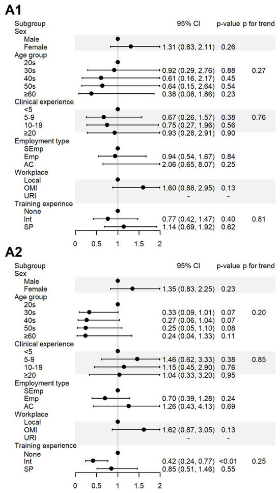 Sociodemographic factors affecting respondents’ attitudes to spontaneous reporting. A1: I agree that KMDs should actively participate in SR; A2: I believe that the role of KMDs is important in SRS. AC, academia group engaged in medical education and/or research; CI, 95% confidence interval; Emp, employed KMD; Int, internship; KMD, traditional Korean medicine doctor; Local, local traditional Korean medicine clinic; OMI, other medical institution; OR, odds ratio; p, p-value; PFT, p for trend; SEmp, self-employed KMD; SP, specialist who had completed an internship and residency; URI, university or research institute.