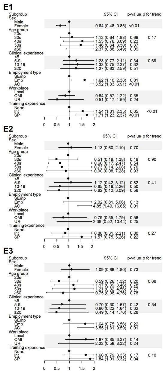 Sociodemographic factors affecting respondents’ experiences of spontaneous reporting. E1: I have never experienced or witnessed an ADE following drug administration; E2: I have never reported an ADE to the relevant authority; E3: I have received training on PV, including SRS procedures and causality assessment. AC, academia group engaged in medical education and/or research; CI, 95% confidence interval; Emp, employed KMD; Int, internship; KMD, traditional Korean medicine doctor; Local, local traditional Korean medicine clinic; OMI, other medical institution; OR, odds ratio; p, p-value; PFT, p for trend; SEmp, self-employed KMD; SP, specialist who had completed an internship and residency; URI, university or research institute.