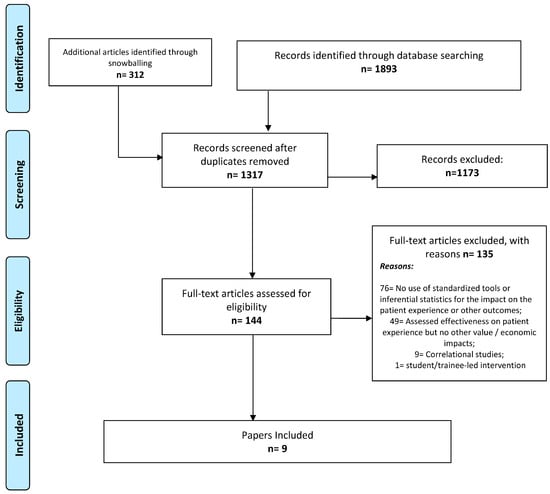 Figure 1 provides the PRISMA flowchart of this review. Out of the 1317 unique references, 144 full texts were assessed, and nine were included—all from the USA. Of the studies on patient experience that also assessed other value-based impacts, while some could focus on more than one impact type, five focused on economic impact, three on provider well-being/burnout, and four on healthcare utilization. Two studies that assessed readmission rates also assessed economic impacts, i.e., they fit in both categories.