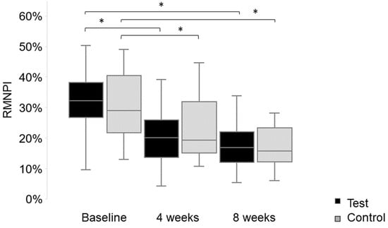 At the baseline, the median full mouth RMNPI in the test group was 32.14% (range: 9.52–50.20%) and 28.98% (range: 12.89–49.01%) in the control group (p = 0.529). After four weeks of oil pulling, the full mouth reduction in the RMNPI was 10.71% (0.79–46.23%) in the test group and 11.51% (−6.55–28.60%) in the control group. Both groups showed a statistically significant reduction within the group (p < 0.001) (see Figure 1), but no significant difference between the groups (p = 0.716). After eight weeks of oil pulling, the full mouth reduction in the RMNPI was 13.99% (3.94–46.23%) in the test group and 14.25% (−0.01–28.60%) in the control group. Both groups showed a statistically significant reduction within the group (p < 0.001) (see Figure 1), but no significant difference between the groups (p = 0.987). There were no statistically significant differences between the test and control groups at any time, neither for the full mouth RMNPI nor for the subscales (see Table 1).