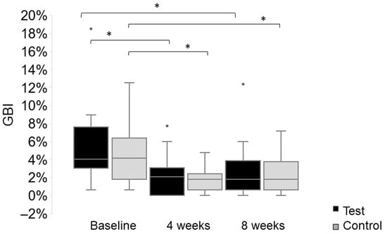 At the baseline, the median full mouth GBI in the test group was 4.01% (range: 0.60–18.52%) and 4.17% (range: 0.60–12.5%) in the control group (p = 0.678). After four weeks of oil pulling, the reduction in the full mouth GBI was 1.39% (0–31.55%) in the test group and 1.92% (−1.19–10.12%) in the control group. Both groups showed a statistically significant reduction within the group (p < 0.001) (see Figure 2), but no significant difference between the groups (p = 0.536). After eight weeks of oil pulling, the reduction in the full mouth GBI was 2.38% (−1.19–31.55%) in the test group and 2.98% (−2.38–6.55%) in the control group. Both groups showed a statistically significant reduction within the group (p < 0.002) (see Figure 2), but no significant difference between the groups (p = 0.937). There were no other statistically significant differences in the subgroup analyses, neither in the test nor in the control group.