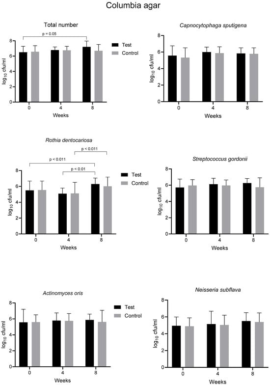 As in the previous study [24], we investigated the eleven prevailing bacterial species from supragingival plaque samples. Additionally, smooth and rough colonies of streptococci were distinguished by mitis salivarius agar. The courses of CFU counts of total numbers of bacteria and of numbers of single species selected for evaluation are depicted in Figure 3 and Supplementary Figures S1–S3. Overall, we could not find differences in the bacterial counts between the test and control groups, with only one exception for Streptococcus oralis on Schaedler agar after 1 month of pulling (difference of 0.39 log10, p = 0.0268). There were the following few scattered and small increases in bacterial counts over time within each group. These increases comprised the total number after two months compared to the baseline in the test group (0.69 log10 on Columbia and 0.54 log10 on chocolate agar), Rothia dentocariosa in both groups (0.81 and 0.91 log10 on Columbia and 1.0 and 1.14 log10 on chocolate agar for the test and control samples, respectively), Streptococcus anginosus in both groups (0.93 log10 and 0.83 log10 on chocolate agar for the test and control samples, respectively), and Capnocytophaga sputigena in the test group (0.90 log10 on Schaedler agar) (Figure 3, Figures S1 and S2). No significant changes over time were found on mitis salivarius agar (Figure S3). All significant changes remained small and within 1 log10 with one exception (1.14 log10 for R. dentocariosa controls on chocolate agar).