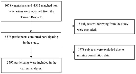 This observational, matched case-control study utilized data from the Taiwan Biobank database [42]. We identified 1073 vegetarians and matched them at a 1:4 ratio with 4302 non-vegetarians based on age and sex, forming a matched cohort. After excluding 1778 individuals lacking data on TCM body constitution, 3597 participants remained for analysis (Figure 1). Direct participant contact was not required; thus, informed consent was waived. The study protocol was approved by the Institutional Review Board of Taipei Veterans General Hospital (Approval No. 2018-04-009ACF) and was registered at ClinicalTrials.gov (NCT03938207, study start: 1 October 2022).