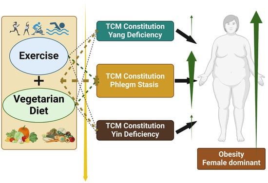Exercise training, including both aerobic and resistance exercises, has been shown to be effective in reducing chronic inflammation among individuals with obesity who have elevated levels of inflammatory biomarkers [55]. Our findings indicate that physical activity is associated not only with a lower likelihood of developing TCM body constitutions such as Yin deficiency, Yang deficiency, and Phlegm stasis, but also with a reduced risk of obesity. In addition to its anti-inflammatory effects, regular physical activity has been linked to improvements in TCM body constitution patterns. A population-based study involving 4497 older adults from the Taiwan Biobank demonstrated that individuals who engaged in consistent physical activity had significantly lower odds of exhibiting Yin deficiency, Yang deficiency, and Phlegm stasis constitutions compared to those who were physically inactive [56]. These findings support the view that exercise may serve as a modifiable behavioral factor that helps prevent imbalanced constitutional states and promotes both physical and psychological health.