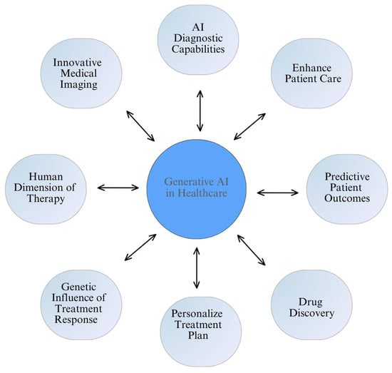 Key applications and benefits of generative AI in healthcare. This schematic illustrates the multifaceted contributions of generative AI, including enhanced diagnostic capabilities, predictive patient outcomes, personalized treatment plans, drug discovery, and support for the human dimension of therapy. These interconnected functions highlight the potential of generative AI to transform both clinical practice and biomedical research.