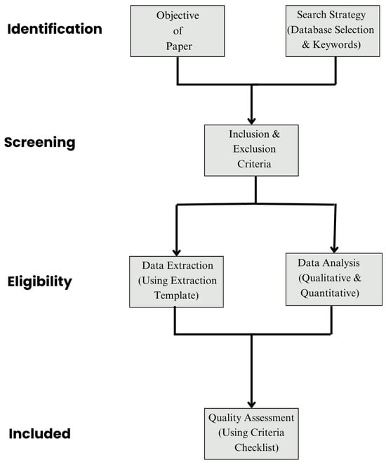 It highlights a structured approach from defining research objectives and search strategies to applying selection criteria, extracting and analyzing data, and conducting quality assessment.