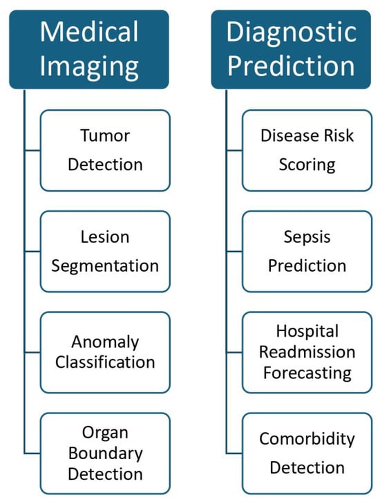One of the most successful applications of Narrow AI is in medical image analysis. Convolutional neural networks (CNNs) have demonstrated near human performance in tasks such as identifying pneumonia in chest X-rays, breast cancer in mammograms, and retinal abnormalities in fundus images [46,47,48,49]. These AI models are trained on labeled datasets and can process thousands of images in seconds, offering support for early diagnosis and reducing radiologist workload [50].