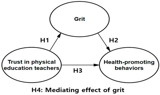 To assess the dynamics of these factors, our study looks at middle school students’ trust in PE teachers and their grit to assess the impact of these on health-promoting behaviors, considering grit as a mediator. Thus, we fill a gap in the literature by testing how, through the development of grit as a driver of continuous exercise practice, trust in PE teachers encourages health-promoting behaviors among adolescents. Hence, distinct from previous research, we explore the mediating role of grit in the relationship between PE teacher trust and healthy behaviors. Accordingly, we posited the following hypotheses among middle school students (Figure 1).
