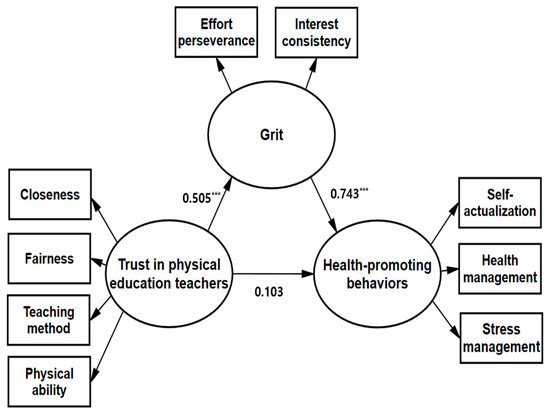Ultimately, we found that grit mediated the relationship between trust in PE teachers and health-promoting behaviors, supporting Hypothesis 4. This is consistent with studies that point to a high positive correlation among trust in coaches, grit, and the continued exercise intention of college soccer players [53]. This also suggests that trust in PE teachers influences the development of healthy lifestyle habits by strengthening student grit, rather than by directly influencing healthy behavior. In other words, the greater the students’ trust in their PE teachers, the more they perform physical activities based on perseverance and patience; this, then, engenders health-promoting behaviors. As such, PE teachers play the role of psychological supporter; someone who develops student perseverance and patience rather than just offering technical instruction.