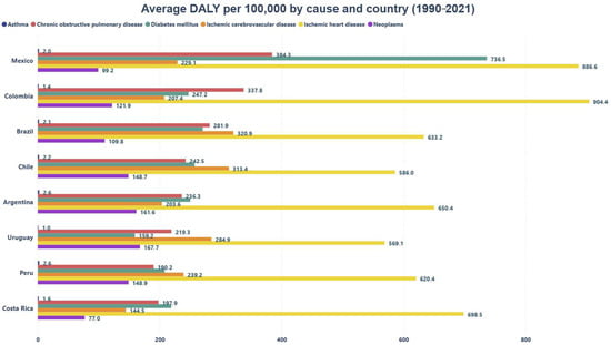 Additionally, it is noteworthy that Mexico is the only country where diabetes mellitus ranks second in terms of DALY burden. In Colombia, COPD is the condition with the highest impact on DALYs. Finally, asthma consistently shows the lowest DALY burden across all the countries analyzed.