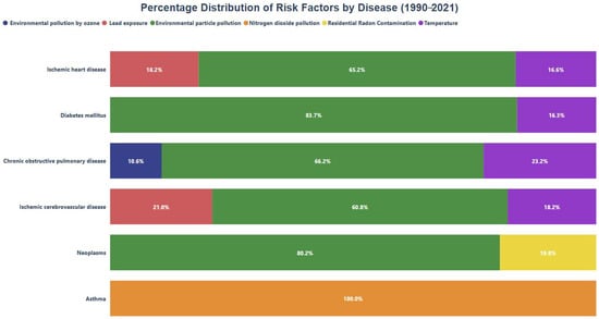 Regarding neoplasms, a significant portion of the burden is associated with residential radon exposure. On the other hand, although lead exposure is not the primary risk factor for any specific disease, it still holds considerable relevance in increasing disease burden, particularly in ischemic heart disease and ischemic stroke. Additionally, ozone (O3) pollution accounts for 10.60% of the COPD burden, while nitrogen dioxide (NO2) pollution constitutes 100% of the attributable risk factor for asthma, standing out as the sole relevant risk factor for this condition.