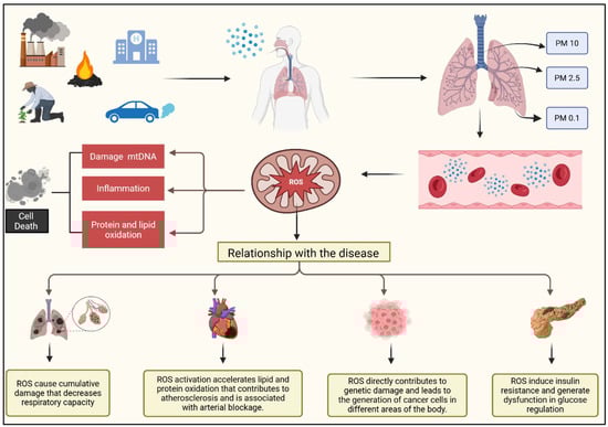 Biological mechanisms of ambient particulate matter pollution and its relationship with non-communicable diseases. Exposure to particulate matter (PM) generates reactive oxygen species (ROS), which cause mitochondrial DNA damage, trigger inflammation, and promote protein and lipid oxidation. These processes contribute to cumulative respiratory damage, cardiovascular diseases through oxidative stress and atherosclerosis, genetic damage linked to cancer development, and metabolic dysfunction such as insulin resistance and type 2 diabetes [22,23,24,25,26,27,28,29,30].