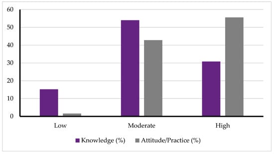 A statistically significant association was found between categorized knowledge levels and attitude/practice levels (χ2, p < 0.001). In addition, the Pearson correlation analysis revealed a moderate positive relationship between total knowledge and attitude/practice scores (r = 0.406, p < 0.001) (Table 3).