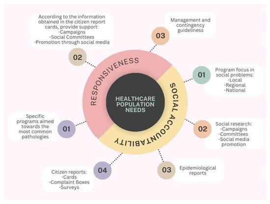 This figure depicts a concentric conceptual model centered on the core element “Healthcare Population Needs”, which is surrounded by two interrelated dimensions: responsiveness and social accountability. These components are represented as semicircular domains encircling the central concept, symbolizing their shared focus on improving health system alignment with community expectations and demands. From the responsiveness domain, three key operational elements emerge: (1) the development of specific programs targeted at the most prevalent pathologies within the population; (2) the implementation of actions informed by citizen report cards, including public health campaigns, the involvement of social committees, and outreach through social media; and (3) the formulation of management protocols and contingency plans to address emerging needs and health crises. Conversely, the social accountability domain comprises four interconnected elements: (1) the design of programs focused on addressing social problems at local, regional, and national levels; (2) the use of social research methods—including campaigns, committee involvement, and media promotion—to understand public concerns; (3) the utilization of epidemiological data to guide planning; and (4) the integration of community feedback mechanisms, such as report cards, complaint boxes, and satisfaction surveys. The figure underscores the structural and functional linkage between these two dimensions and emphasizes their shared purpose in guiding healthcare systems to become more inclusive, responsive, and aligned with the evolving needs of the populations they serve.