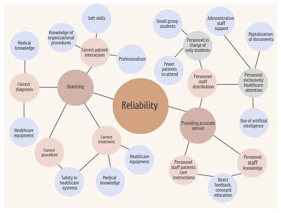 This figure presents a hierarchical conceptual map outlining the key elements that contribute to reliability in healthcare service delivery. At the center of the model is the concept of reliability, which encompasses both institutional infrastructure and personnel-related factors. On the left side, the dimension of “Granting” is represented, including the provision of correct patient interaction, diagnosis, procedures, and treatment. These processes are supported by elements such as knowledge of organizational procedures, soft skills, professionalism, medical knowledge, healthcare equipment, and adherence to safety protocols. On the right side, the concept of “Providing Accurate Service” is detailed, emphasizing the distribution and organization of healthcare personnel. This includes the assignment of staff exclusively to student education—favoring smaller groups and reduced patient loads—as well as personnel focused solely on patient care, supported by administrative staff, document digitalization, and artificial intelligence tools. Additionally, the model highlights the importance of staff education, direct feedback mechanisms, and continuous professional development in ensuring service accuracy and reliability. Overall, the map illustrates the interdependent relationships among organizational resources and human factors that influence the consistent delivery of high-quality care. Institutions are responsible for investigating, identifying, and addressing deficits in social accountability and responsiveness as part of their broader mission to promote health awareness and improve healthcare services.