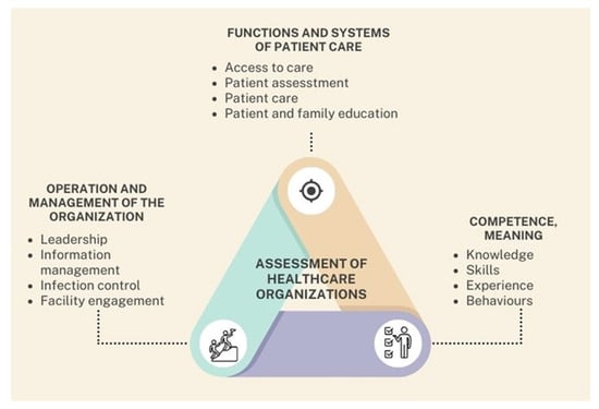 This figure illustrates a triangular conceptual model that outlines three fundamental domains involved in the comprehensive assessment of healthcare organizations. At the center lies the unifying concept “Assessment of Healthcare Organizations”, which represents the ongoing and dynamic process through which institutions evaluate their operational performance, identify strengths and weaknesses, and implement strategies for continuous improvement. Each vertex of the triangle corresponds to a critical dimension of institutional evaluation. The upper corner represents functions and systems of patient care, which encompass essential components such as access to care, patient assessment, clinical care delivery, and education of both patients and their families. The right corner is dedicated to competence, defined as the combination of knowledge, skills, experience, and behaviors demonstrated by healthcare personnel—elements that directly influence the quality and safety of patient care. The left corner focuses on the operation and management of the organization, including leadership effectiveness, information management, infection control practices, and engagement with the physical infrastructure. This triangular framework emphasizes that the evaluation of healthcare organizations must be holistic, continuous, and interdependent. By systematically assessing these three domains, institutions can more effectively address performance gaps, reinforce areas of strength, and strategically evolve the quality of their care delivery systems.