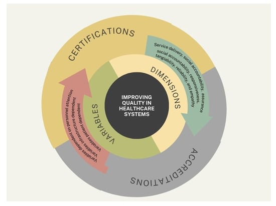 This figure presents a comprehensive, multi-layered conceptual model that synthesizes the key components involved in improving healthcare quality, as discussed throughout this article. At its core lies the central objective: “Improving Quality in Healthcare Systems”, which is surrounded by two major domains—dimensions and variables—represented in a concentric structure. The dimensions domain includes fundamental aspects of care quality, such as service delivery, social accountability, assurance, responsiveness, tangibility, reliability, and empathy. These elements represent the qualitative attributes that define patient-centered, efficient, and equitable healthcare. The variables domain encompasses three distinct yet interconnected categories: variables dependent on personal attention (e.g., staff interaction and training), infrastructure-dependent variables (e.g., equipment and facility readiness), and patient-dependent variables (e.g., adherence, perception, and health literacy). These components reflect the dynamic inputs that influence how quality is implemented and experienced. Encircling these domains is a third layer that highlights the mechanisms for external evaluation: certifications and accreditations. These processes validate that healthcare institutions adhere to recognized quality standards and continuously strive for improvement. Together, the model encapsulates the interplay between internal organizational factors and external evaluative frameworks, offering a unified view of the path toward enhanced healthcare quality. It serves as a visual summary of the article’s conceptual foundation and emphasizes the need for an integrated, systems-based approach to quality improvement.