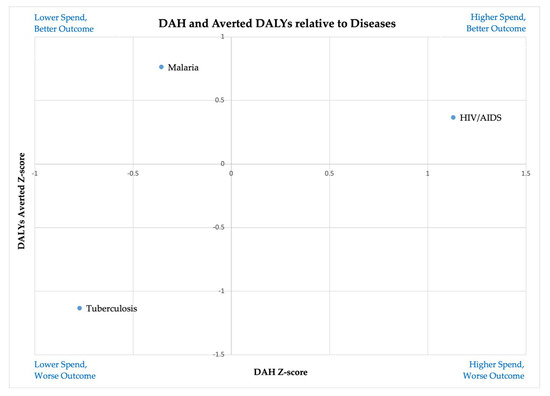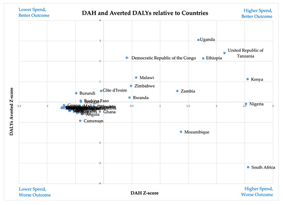 To refine our understanding, we expanded the analysis to examine DAH and averted DALYs per disease and country, with the corresponding Z-scores (Tables S2–S4 in the Supplementary File). This multidimensional mapping enables us to identify countries that are particularly effective (or ineffective) in using DAH for specific diseases. For HIV/AIDS, countries such as Uganda, Tanzania, Kenya, Ethiopia, and Zimbabwe stand out for achieving strong health outcomes relative to their funding levels. These countries combine substantial DAH with above-average performance in terms of DALYs averted, indicating an efficient and impactful use of resources. Conversely, South Africa, Mozambique, and Nigeria received high HIV-related DAH but achieved comparatively poor results in DALYs averted. These cases suggest inefficiencies in converting investment into health outcomes, potentially due to systemic health infrastructure challenges or program delivery issues. Some countries, including Burundi and Rwanda, achieved positive results despite more modest DAH levels, signaling high efficiency and cost-effectiveness in their HIV/AIDS programs.