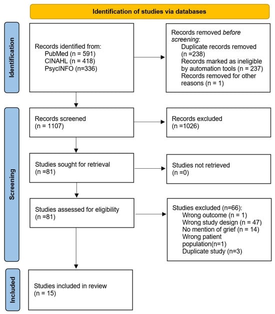 All retrieved references (n = 1345) were imported into Covidence systematic review software (Veritas Health Innovation, Melbourne, Australia) for screening. A total of 237 duplicates were removed automatically, and one additional duplicate was excluded manually. The remaining 1107 studies underwent title and abstract screening by two independent reviewers. Of these, 1026 were excluded due to irrelevance. In total, 89 full-text articles were assessed for eligibility, resulting in the exclusion of 71 studies for reasons including the use of non-validated psychometric instruments, a focus on caregiver grief, or an ineligible design. In three studies, we found that authors used the same study population and dataset for multiple analyses and papers; when this occurred, only the original (first paper) was included in the analysis. Fifteen studies met all the inclusion criteria, were not duplicate studies, and were retained for analysis. The PRISMA flow diagram is presented in Figure 1.
