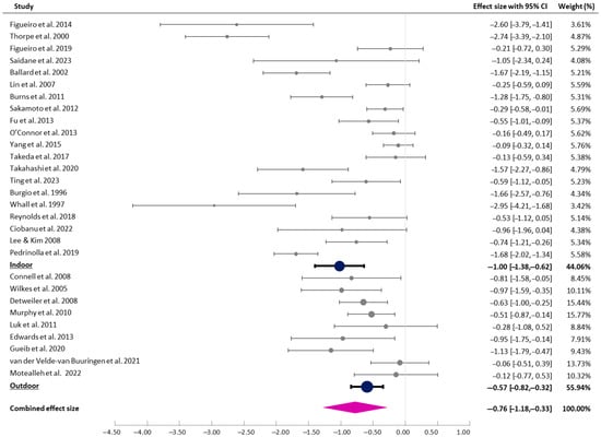 Forest plot of pre–post effects and CIs (indoor vs. outdoor interventions) [7,8,9,29,30,31,32,33,36,37,38,39,40,41,42,43,44,45,46,47,48,49,50,51,52,53,54,55,56].