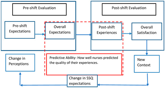 Framework and definitions. This study uses the SSQ framework to explore how nursing students’ perceptions evolve from the beginning to the end of a clinical shift. The framework highlights how students form expectations based on prior experiences and how those expectations shift after real-time exposure to stressors, support, and workload. A key feature of the model is its cyclical nature: post-shift experiences inform future pre-shift expectations, which then shape ongoing perceptions of stress and satisfaction [7,33].