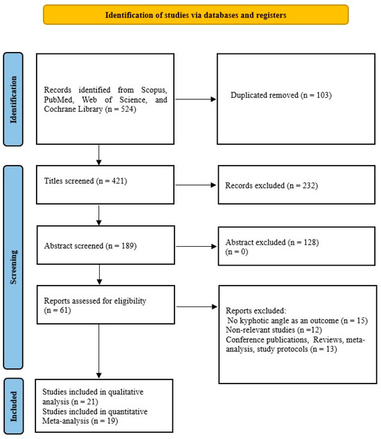 From a total of 524 publications found through four databases, we included 21 studies in our qualitative analysis and 19 in our quantitative analysis. The characteristics of the included studies are shown in Table 1. Of the total studies, 17 were randomized, while 4 were non-randomized. Studies [36,37] that were randomized were not included in the quantitative meta-analysis because their results were influenced by increased heterogeneity and were therefore excluded. There were a total of 1207 respondents in the qualitative synthesis, while there were 1084 respondents in the quantitative synthesis. Of the total number of respondents in the quantitative synthesis, 577 (53.22%) were in the experimental group, while 507 (46.78%) were in the control group. The studies [38,39] had two experimental groups with different types of treatment and one control group and thus were included in the meta-analysis, so there were 21 comparisons. In the experimental group, the mean sample size was 27.58 ± 16.98 (range 11–81), and in the control group, it was 26.68 ± 16.98 (range 9–83). The mean duration of treatment was 14.53 ± 11.58 weeks (range 4–48). The size of the kyphotic curve of the spine is determined by the kyphotic angle. This deformity is diagnosed by spinal radiography [40,41,42,43], spinal mouse device [14,44,45,46], kyphometer [40,41,42,43,44,45,46,47], inclinometer [15,38,39,48,49,50], 4D formetric device [36], computerized bio-photogrammetry [51], six-camera motion analysis system [9], or flexicurve ruler [5,37,52]. Studies [41,42,43] using radiography measured the angle of thoracic kyphosis with the Cobb angle. All studies used strengthening and/or stretching exercises as therapy. In addition to exercises, the study [14] used manual mobilization and taping, the study [15] in addition to the exercises only manual therapy, while the study [48] in addition to the exercises used kinesiotaping. The study [41] uses the Schroth method, the study [47] uses Yoga exercises, and the study [51] uses Pilates, while the other studies use different variations of corrective exercises, as shown in Table 1. Four studies come from Iran [9,37,45,52] 3 from Turkey [39,46,48] 3 from Australia [15,38,43] 3 from the United States of America [5,40,47] 2 from Egypt [36,42] 2 from South Korea [49,50] and one each from China [44], Brazil [51], Belgium [14], and Israel [41].