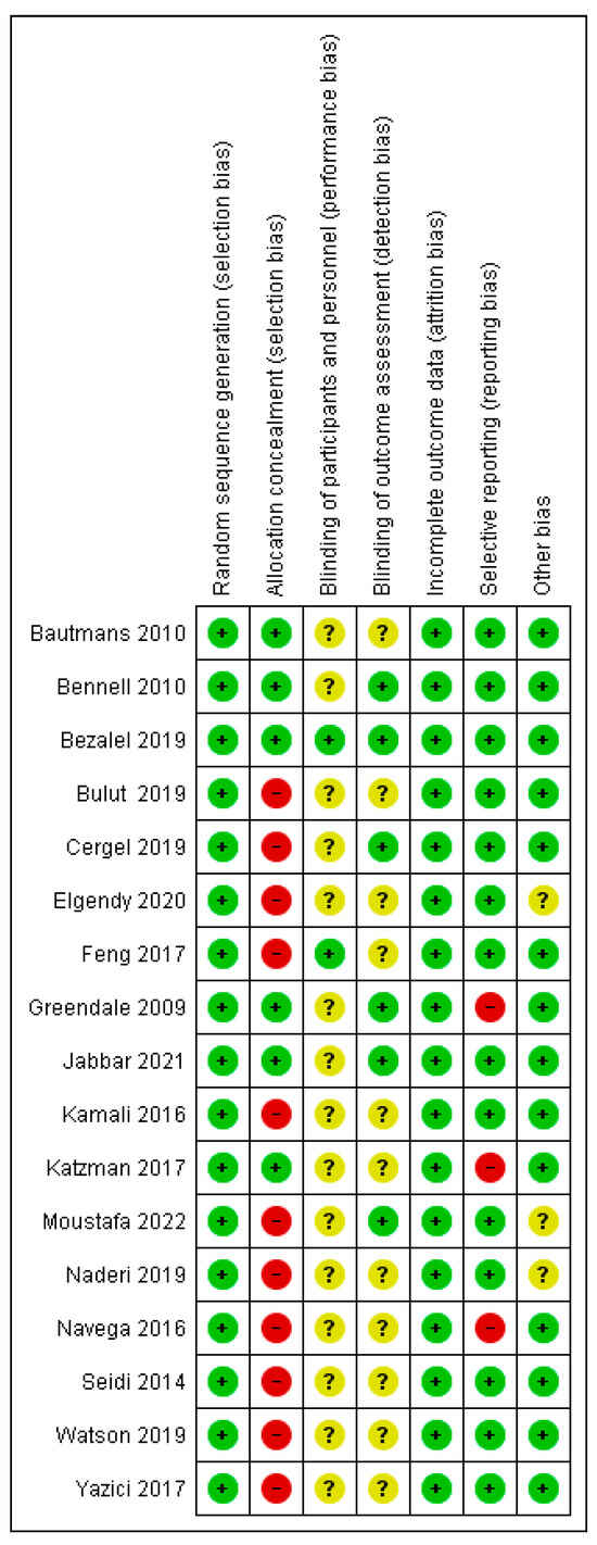Only three records were supported by moderate-quality evidence (GRADE), while six records were supported by low-quality evidence, and four records had very low-quality evidence. Four studies were non-randomized, while the remaining 15 studies in the quantitative analysis were randomized. Of the randomized studies, only study [51] had a high risk in two items. The item “allocation concealment” most frequently showed high risk, while three studies had high risk in the item “selective reporting”, which reduces the methodological quality of the included randomized studies. All non-randomized studies were comparative with satisfactory test results and were included in the study, but they were categorized as high-risk. Heterogeneity ranged from 0% to 58%, depending on the subgroup. Studies with results leading to heterogeneity were immediately excluded from further analysis. Studies [40,47,51] did not present results in the manner required for meta-analysis, and these studies were rated as high risk in the “selective reporting” item. This issue was addressed according to instructions [28,53,54]. The publication bias of the included studies was not statistically significant. The search for studies was comprehensive, using four databases without language restrictions. We believe that there are no studies that meet the criteria and were not included in our analysis.