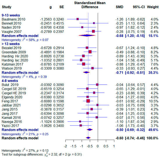 We classified the shortest treatment into the subgroup between 4 and 8 weeks. Ten studies used this duration of treatment, and a total of 551 (48.99%) subjects, of which 61 (11.49%) subjects in the control group did not receive any treatment. The results of the meta-analysis show statistical significance with a moderate effect size (SMD = −0.50; 95% CI = −0.69, −0.32; p < 0.0001; GRADE: moderate (Table 2) and heterogeneity (I2 = 21%, p = 0.25) (Figure 4).