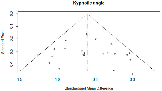 The number of studies that measured the kyphotic angle was 19. There were a total of 1084 subjects, of which 577 (53.22%) were in the experimental group and 507 (46.78%) in the control group. Ten studies (52.63%) in the control group did not have any treatment; that is, 272 (25.09%) respondents out of the total number. The performed analysis shows statistically significant results with a moderate effect size (SMD = −0.60; 95% CI = −0.74, −0.46; p < 0.0001; GRADE: low (Table 2) and heterogeneity (I2 = 27%, p = 0.13) (Figure 4). Sensitivity analysis shows that excluding the study 15 would reduce the heterogeneity to 18% and the effect size to (SMD = −0.57). Publication bias was not statistically significant by Egger’s test (intercept 0.103; 95% CI = −1.868, 2.075; p = 0.92) (Figure 5).