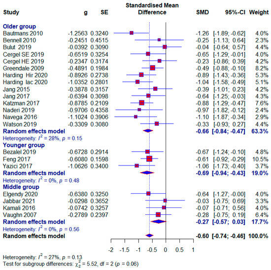 Twelve studies were included in the Older group, with 696 (64.21%) respondents, of which 151 (21.70%) in the control group did not receive any treatment. Statistical significance with a moderate effect occurs in this subgroup (SMD = −0.66; 95% CI = −0.84, −0.47; p < 0.0001; GRADE: low (Table 2) and heterogeneity (I2 = 28%, p = 0.15) (Figure 6). Excluding study [14] would reduce the effect size to 0.62 and the heterogeneity to 17%.
