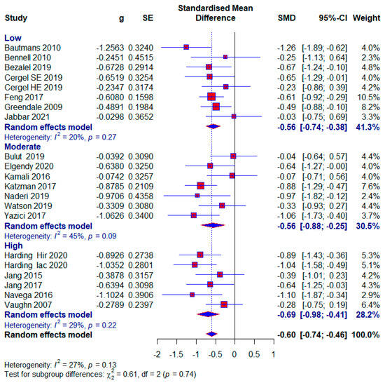 Seven studies were assessed as being at low risk of bias, with 477 (44%) subjects. A moderate effect size with statistical significance appears in this subgroup (SMD = −0.56; 95% CI = −0.74, −0.38; p < 0.0001; GRADE: moderate (Table 2) and heterogeneity (I2 = 20%, p = 0.27) (Figure 7).